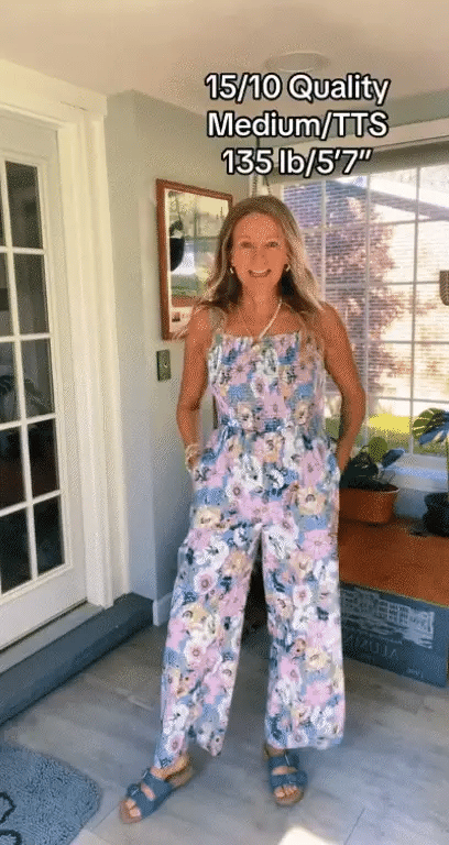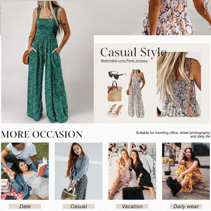 Womens jumpsuit design with sleeveless, square neck, floral print, high waist, smocked bust,wide leg long pants, two pockets, one piece jumpsuits, summer outfits for women.
